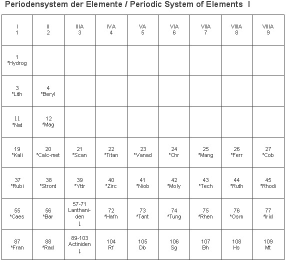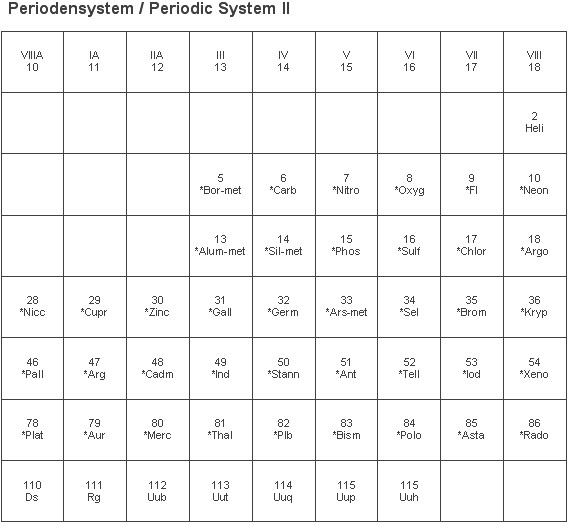 Instead we will here give the periodic table of elements showing to which groups the elements belong. And in the groups we will only list those compounds that have been proven, that have important common names or that are easily mixed up with others or that are in any way noteworthy for modern homoeopathy.